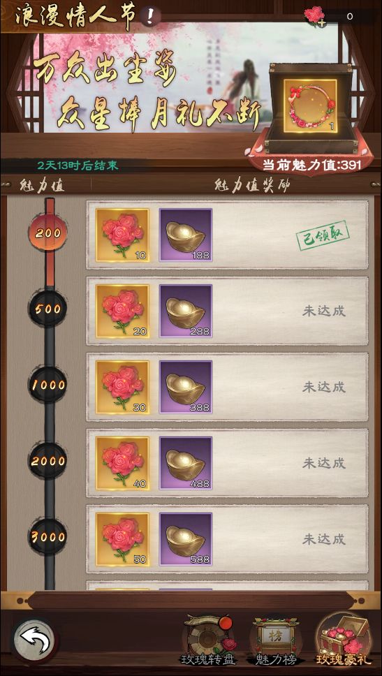 获得的魅力值到达对应档位后可领取奖励,活动结束后如果少主未领取奖励则会通过邮件自动发放。