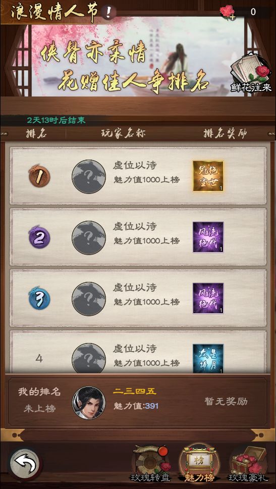 少主们在游历、速战、擂台比武、江湖战斗后有概率获得鲜花,鲜花可以赠送给【好友】,送花/收花的对象会获得魅力值,并进入排行榜,排行榜为全服跨服排行榜。