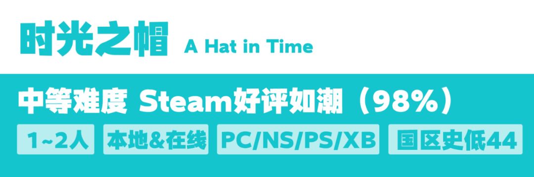 一款极其优秀但是知名度不高的平台跳跃游戏,关卡设计非常精妙,主角可爱,剧情轻松欢乐,总之就是好玩,Steam上98%的好评就是最好的证据。如果你喜欢马里奥的3D平台跳跃游戏的话,那么你一定会喜欢《时光之帽》,它同样能让你找回童年最纯粹的快乐,而且多人体验也很棒,除了难度略高之外,实在找不到什么缺点。