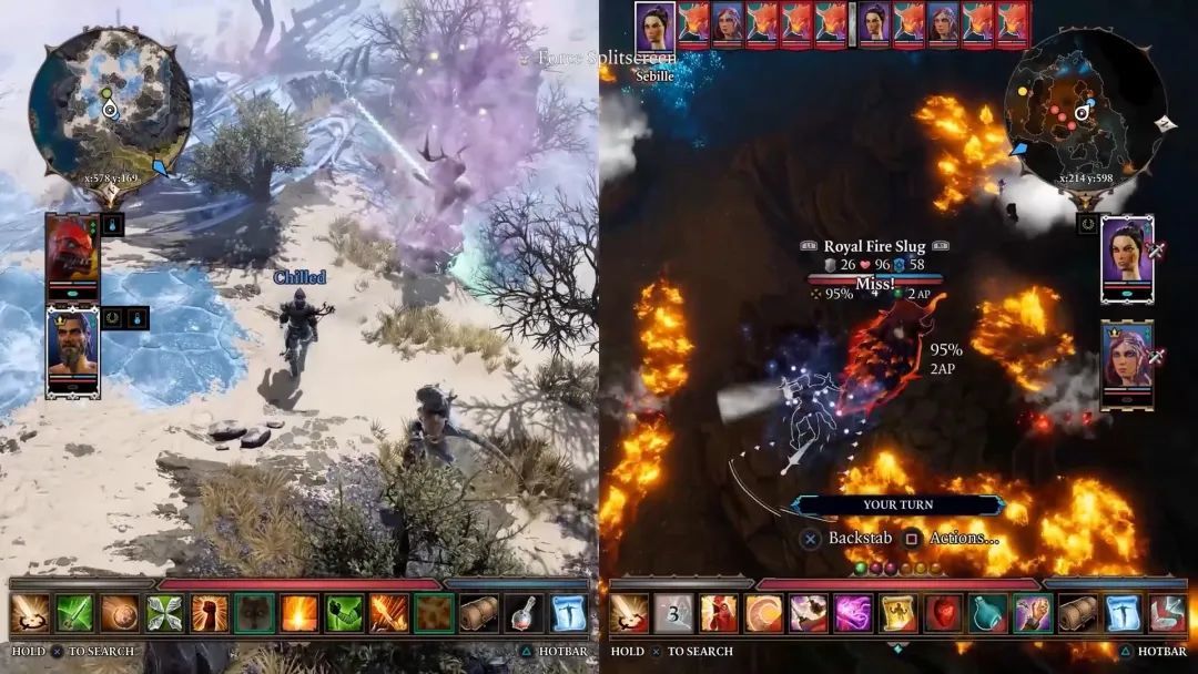 技能之间的元素互动让这款游戏大放光彩,油能减速、遇火爆炸、水可灭火并产生蒸汽,水和蒸汽可以导电、电使人麻痹,冰霜除了冻结敌人,还能把水滩变成冰面,人物走过冰面还会滑到。