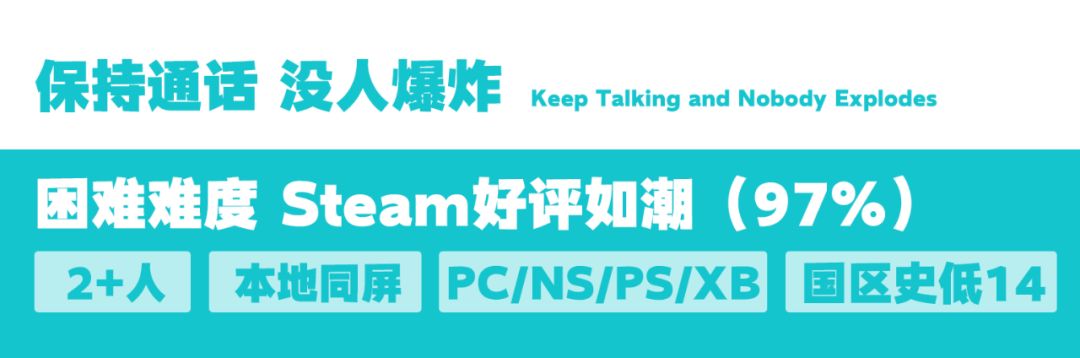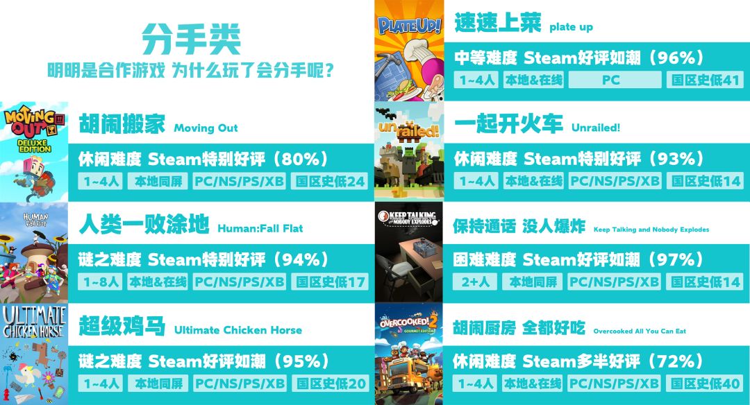 严格来说派对游戏不算是一般意义上的多人合作游戏,所以这里就不展开介绍了,直接给大家推荐3款评价比较高的,有需要可以自取。
