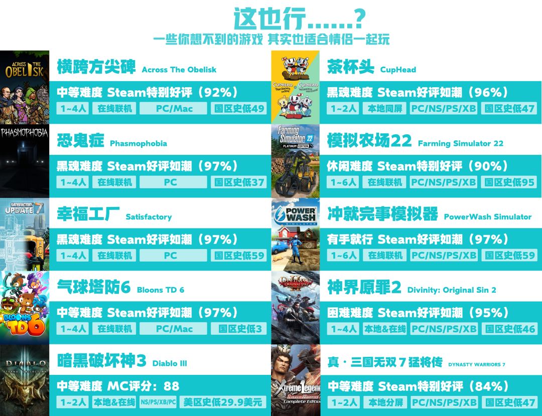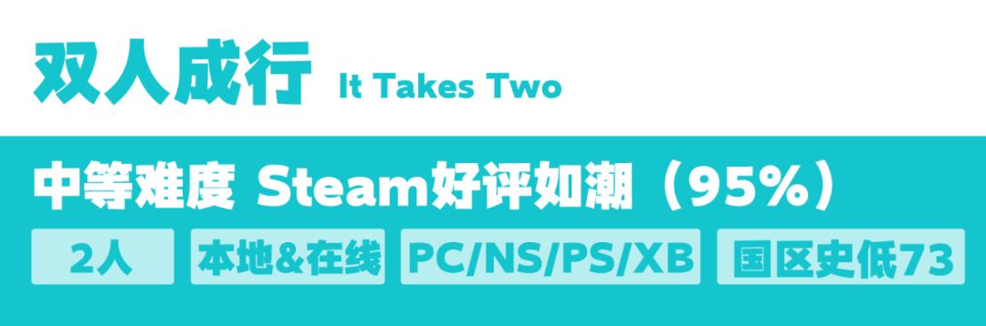 考虑到选择合作游戏时影响最大的两个因素就是游戏类型和游戏难度,也就是说你的男朋友/女朋友喜不喜欢,能不能上手才是关键。所以这次我们的合作游戏推荐也会按照游戏类型来分类给大家推荐,并综合操作难度和玩法上手难度综合给出一个难度评级。对于像《双人成行》《马里奥派对》之类地球人都知道的游戏,我们不会过多介绍,重点给大家安利一些Steam好评度高,但不是人尽皆知的合作游戏。