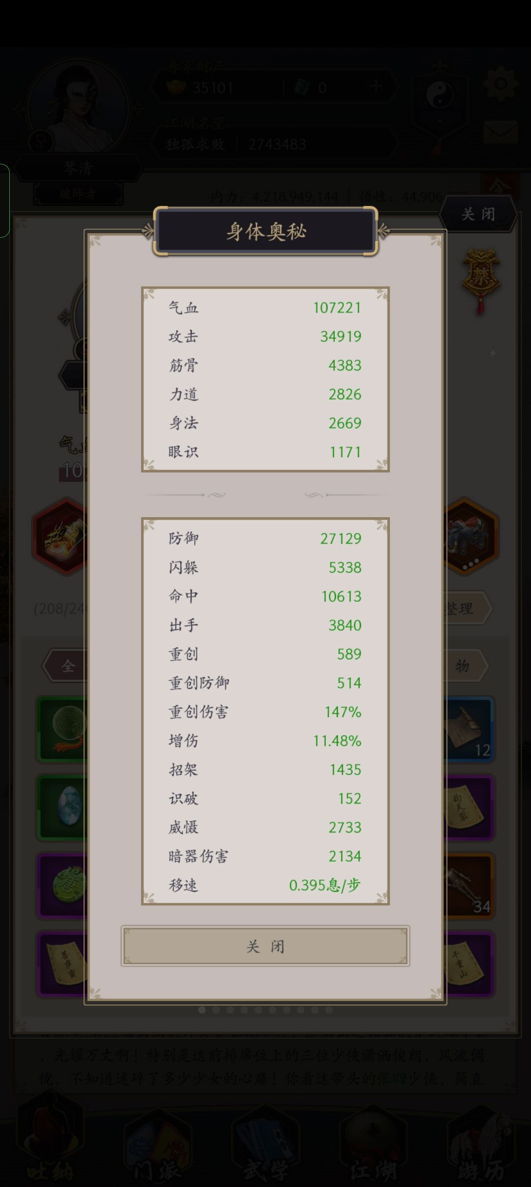主动武学:焚天+地龙+风灵+追风无影腿(君山武学)+雾渺+踏浪离恨+魁隗碎影踢+星斗破阵+飞星流云+雪纵连踢+渊龙破云+天舞飞仙脚+追影落雁腿+天相闪影+藏马破阵。所有技能均无精要