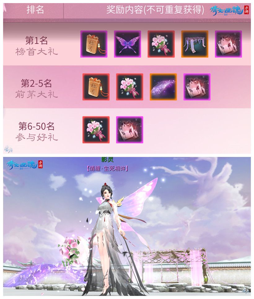 每日排名前十的眷侣还可在19: 00-19:30,通过【一往情深】活动入口前往活动秀场【萤花海】,寻找自己的花枝使者上台秀恩爱,抛出的喜糖有机会开出内含银票的恩爱小红包、恩爱大红包以及相思宝匣!同时参与【一往情深】活动的玩家也可获得丰厚的银票、元宝、百合花枝(投赠可增加恩爱度)等奖励!