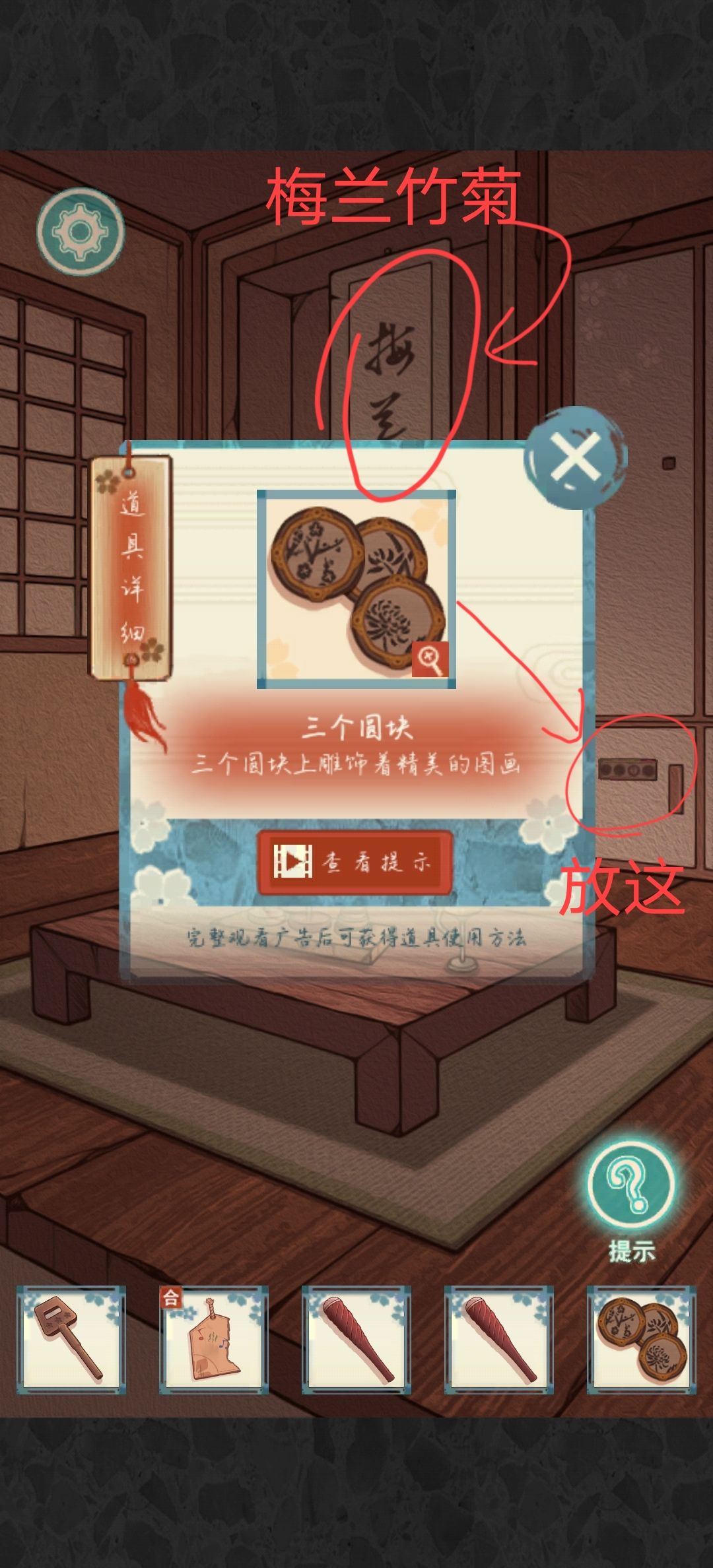 来到内室后方(和室)点击桌子上的木块完成游戏得到三个圆块