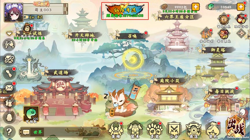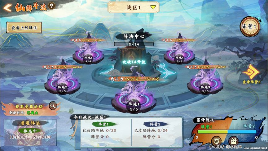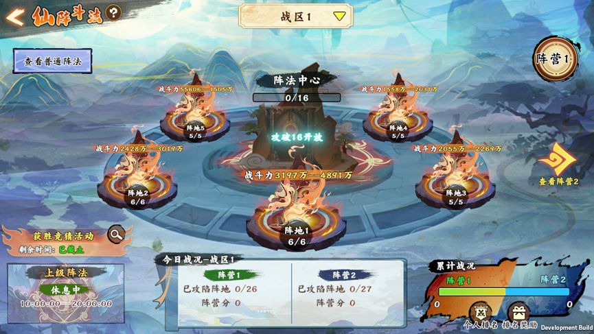 斗法期的每天可挑战的时间段为(10:00-20:00),其余时间为休息时间。在休息时间,不可进行挑战。攻打完敌方一定数量的阵地后,则可以攻打敌方大本营,双方大本营均为来自仙阵斗法中心的无限血量boss,根据攻打boss的血量计算阵营分。在休息时间,萌主们可以调整自己的阵容。