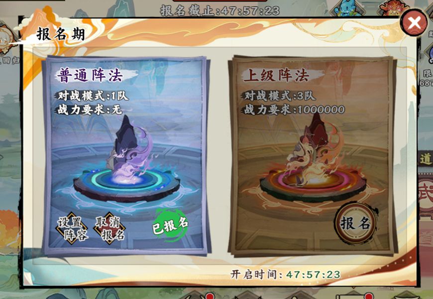 报名期,萌主们点击进入仙阵斗法,可选择普通阵法和上级阵法。萌主们可根据自身实力来选择,【上级阵法(3v3)】和【普通阵法(1v1)】(上级阵法需要最强一队达到一定战力才能进行报名)。