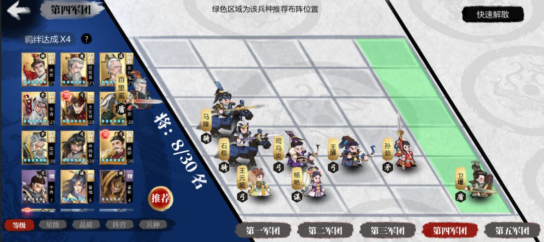 ● 编组布阵中,拖动兵种系统会显示推荐布阵列位置