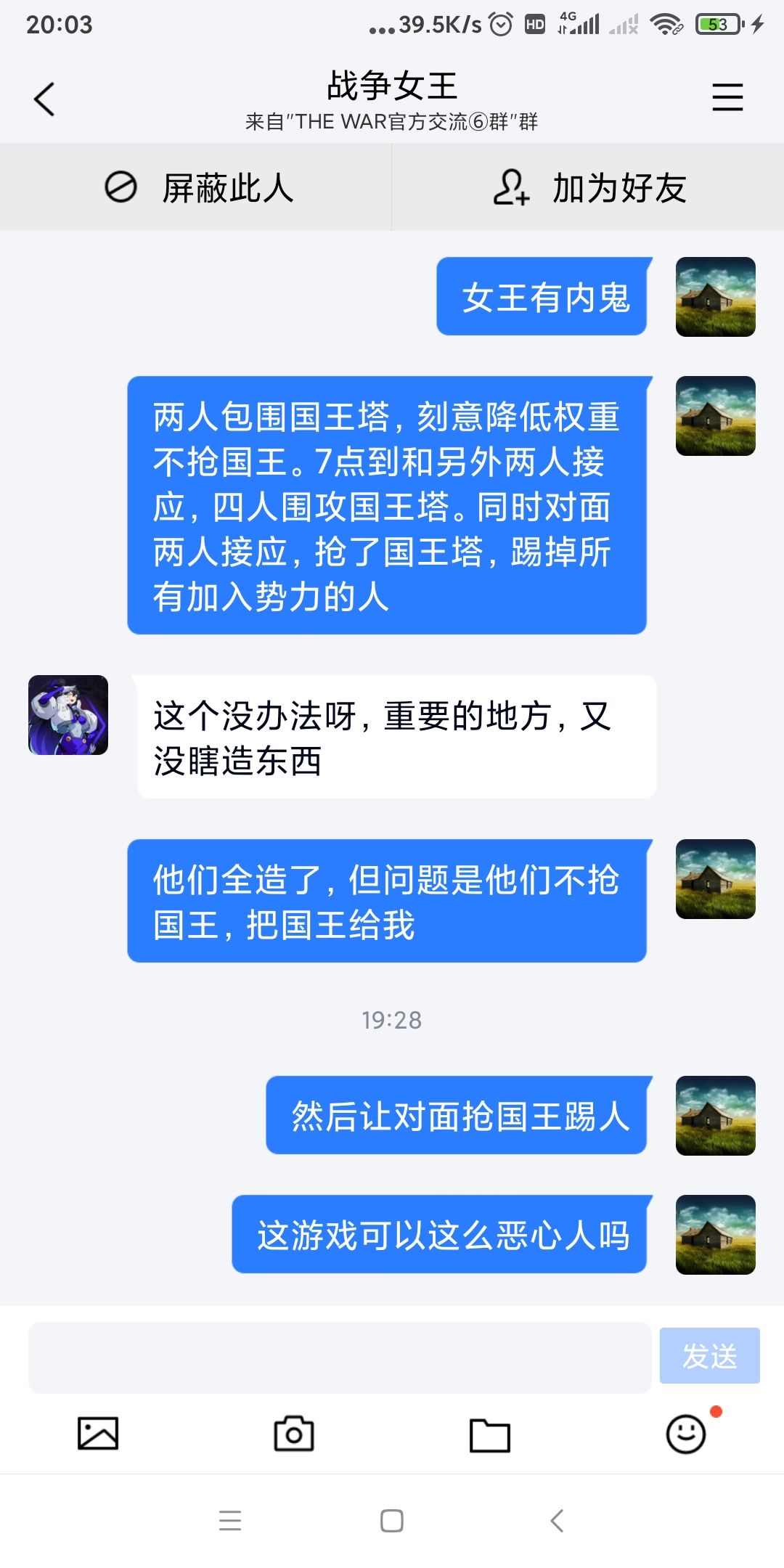 本局,两个玩家提前包围国王塔,但刻意降低权重,把国王随给我;同时,对面两个互相接应,抢了国王,踢掉所有不在车队的玩家;他们招募剩余车队成员,两小时内打穿两次国王塔。