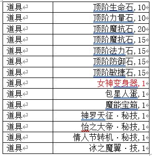V6:女神项链*1+女神之握*1+天星金币*20+60000M+30万G币+随机顶阶强化石*40+1~4阶技能升级指南*15+经验套餐*30