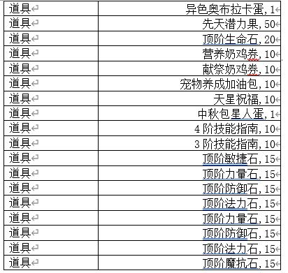 10元,高阶强化石*10+先天潜力果*2+美味蟹柳*1