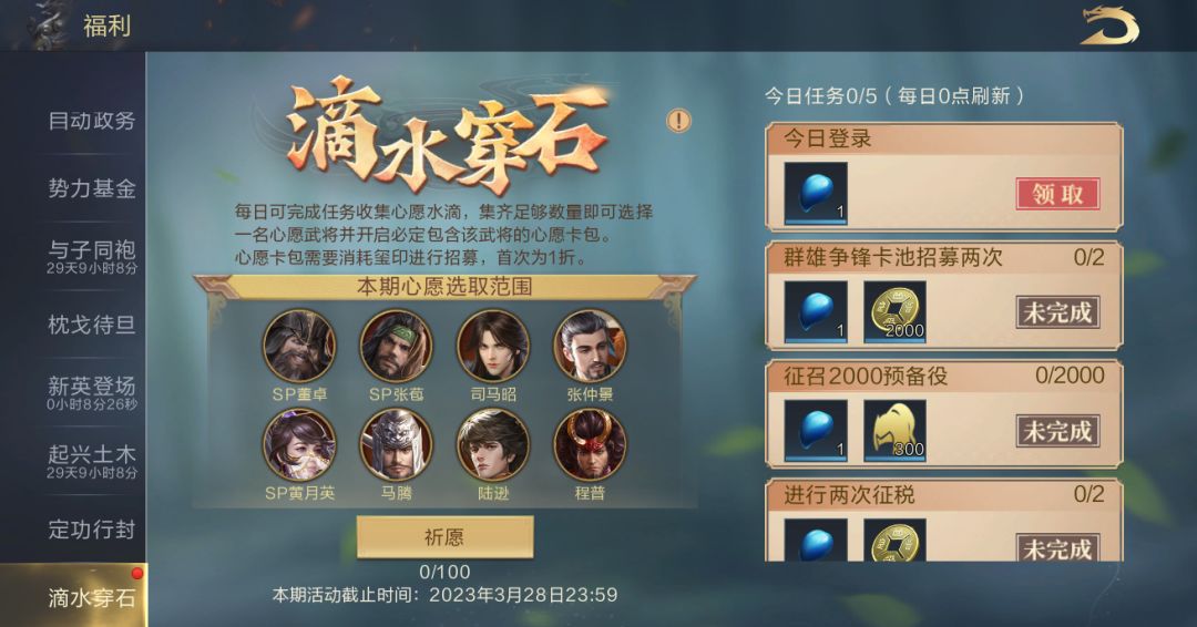 1.主公可以完成每日任务,获得心愿水滴及其他道具奖励。