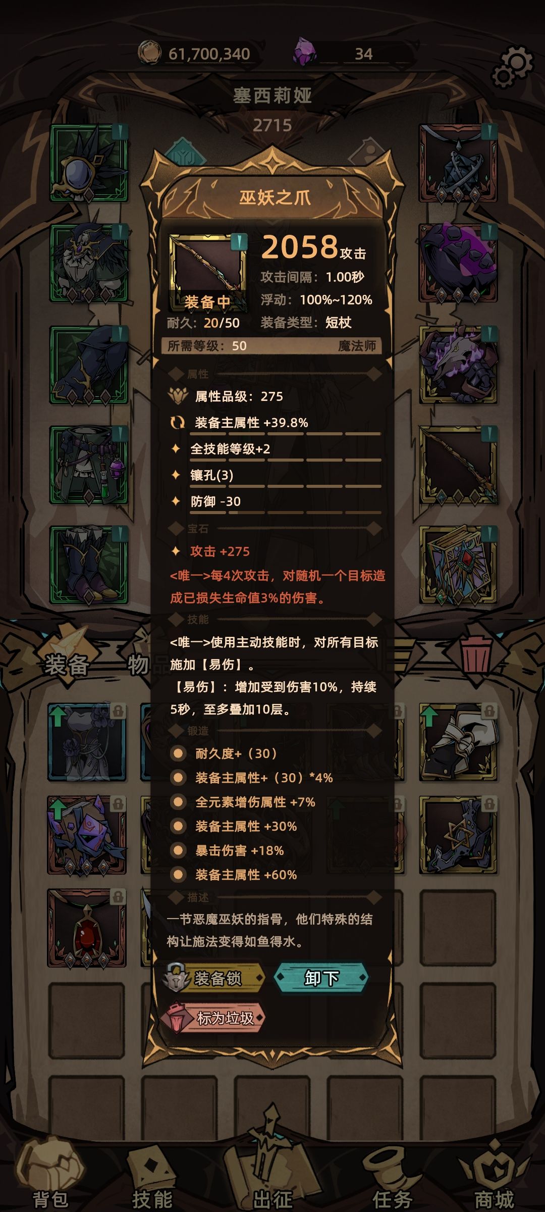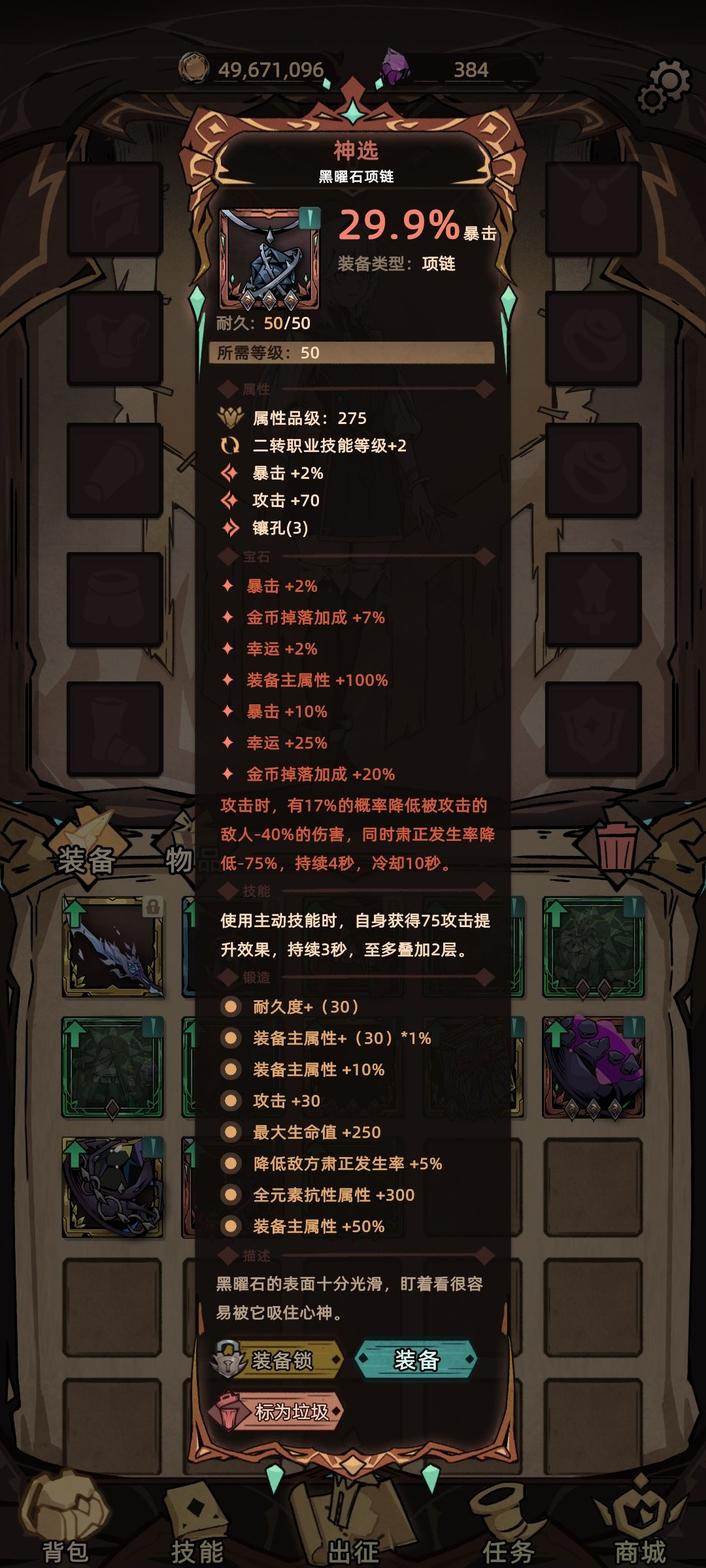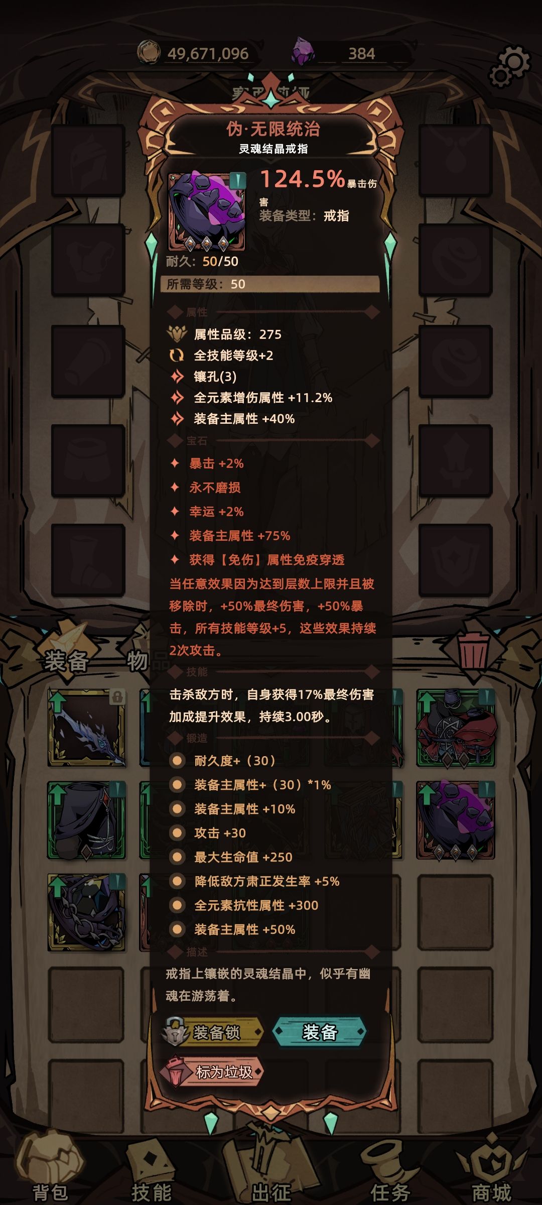 其余词条一定要堆满10级技能等级(无限统治提供5级一共15级,且核心技能新兴学派最高额外加10级),其次选择全元素增幅,最后选择爆伤攻击暴击。另外首饰主属性选择暴击爆伤。