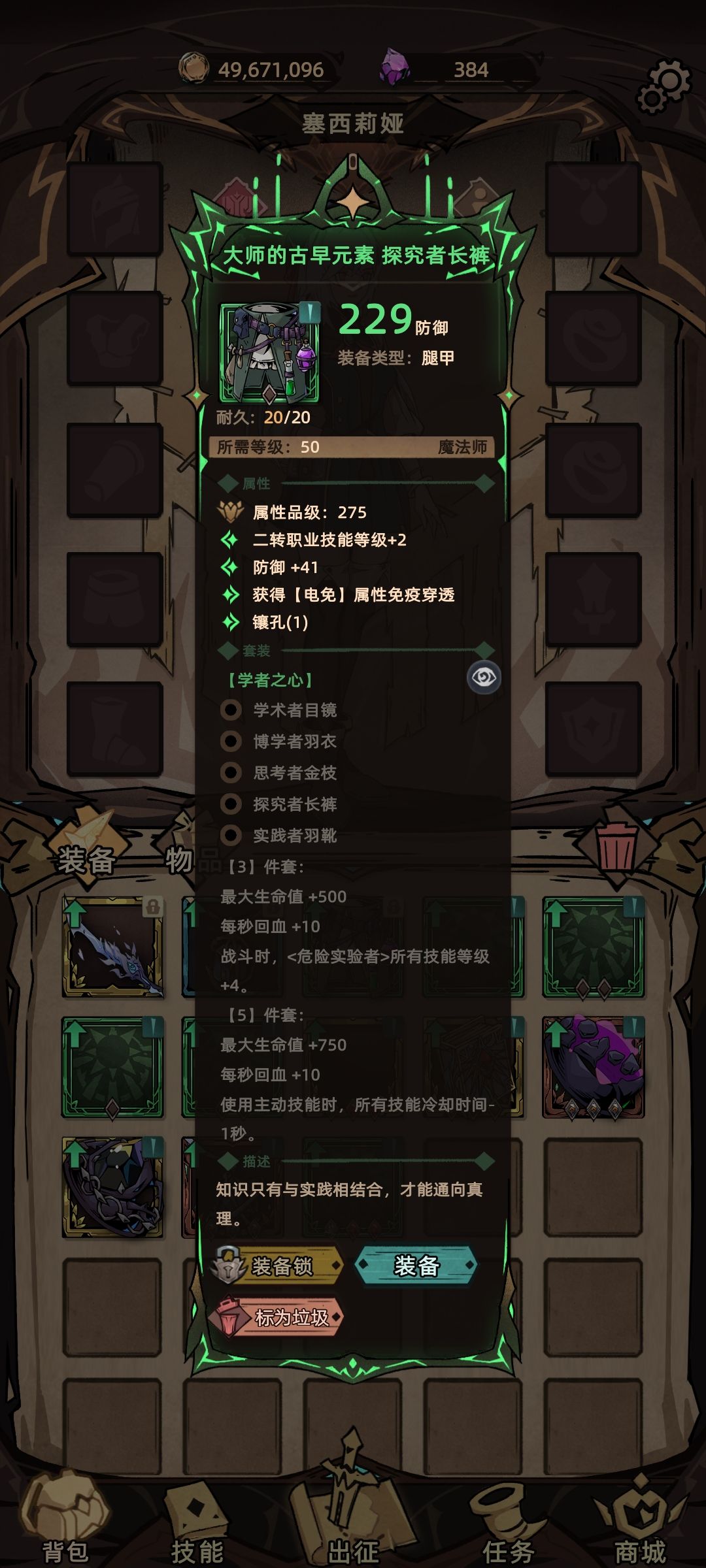 左边学者套由于获取难度极大,词条优先选择带孔,其次全元素增幅。 右边项链神选,词条最好有一条主属性加成。