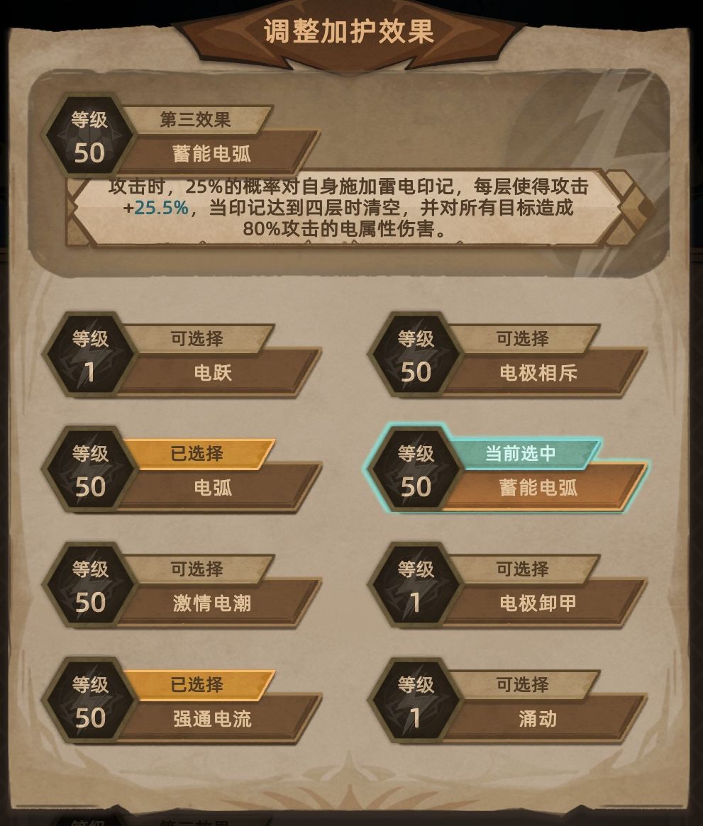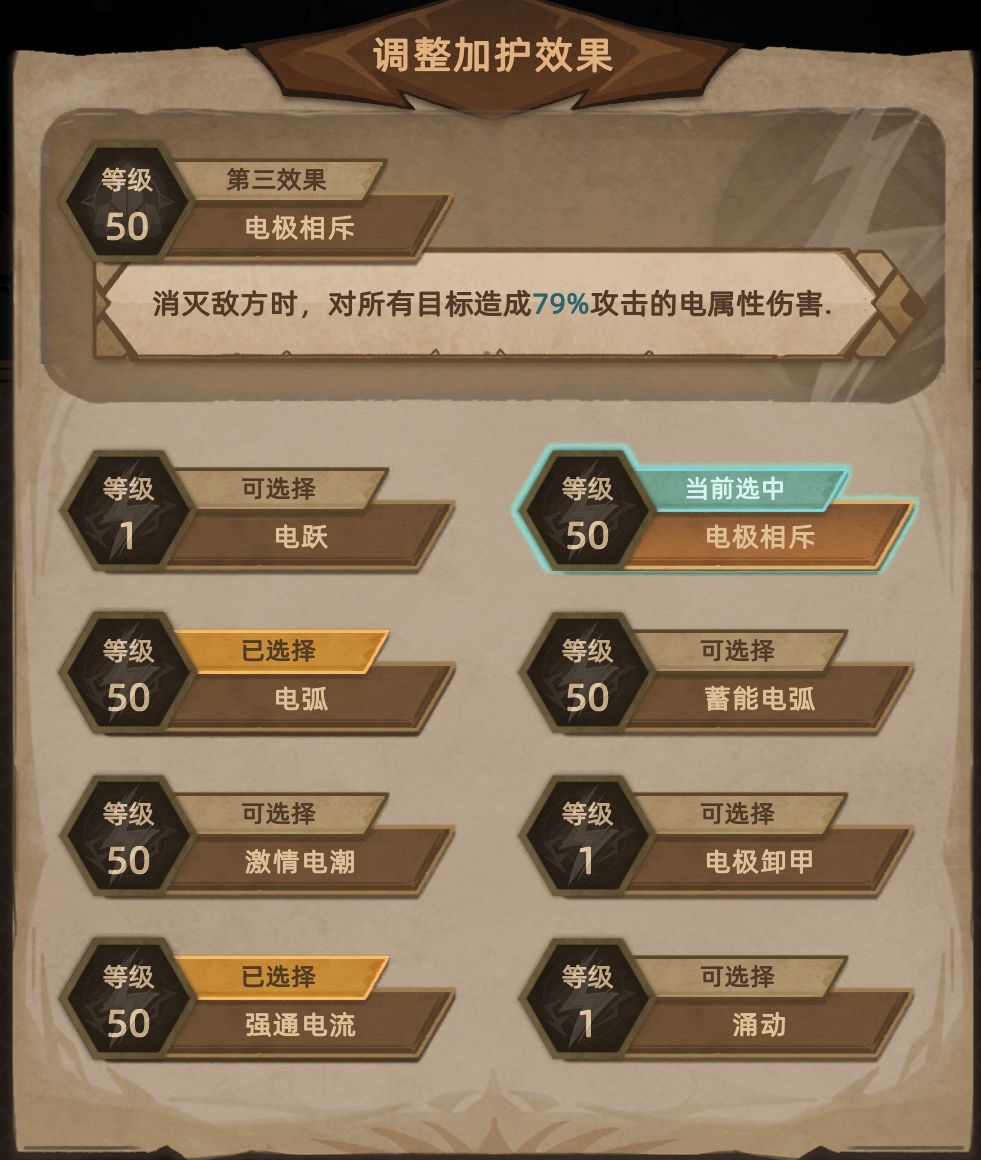 电弧和强通电流必带,电极相斥用来刷材料,蓄能电弧用来应对难度关卡,比如正塔115和120层,以上4种皆要点满,其他不用点。