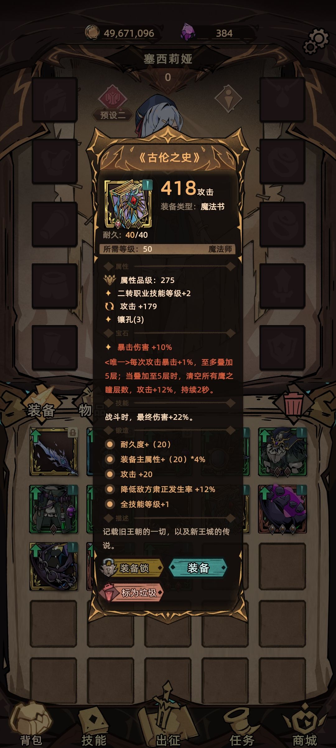 武器推荐巫妖之爪,如果有30级贪欲之刃也可以用。魔法书推荐古伦之史。
