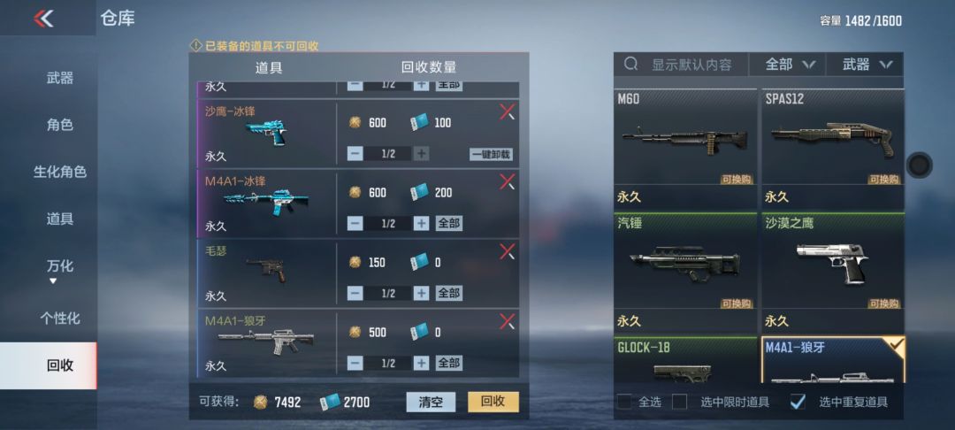 在之前的回收功能中,有些重复道具比如武器可能会因为精通等级不同而“逃脱”算法的识别,现在优化了筛选逻辑之后,仓库中的重复道具能够被更精准的筛选出来,不用我们进行二次筛选。