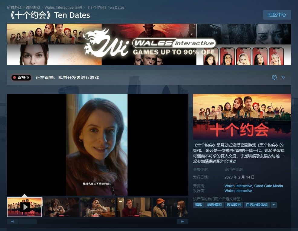 真人互动式浪漫喜剧游戏《五个约会》续作《十个约会》今日(2月14日)正式发售,登陆Xbox Series X|S、Xbox One、PS5、PS4、Switch和PC,Steam版国区定价62元,首周折扣价55.8元,游戏支持中文,支持Steam Deck。