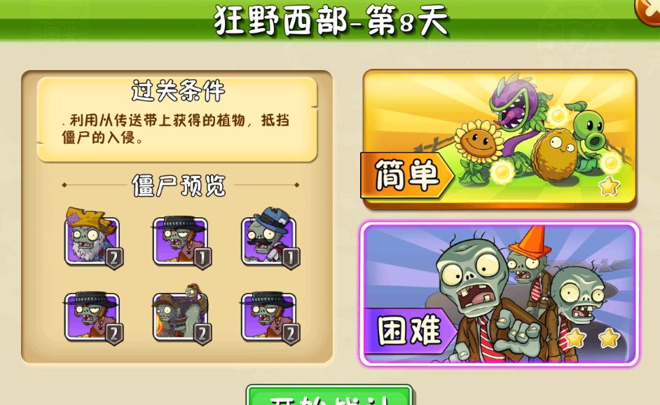 通关条件:我们需要利用传送带上的植物成功抵挡僵尸入侵。这一关的难点就在于不能自己挑选植物,并且有3波西部巨人僵尸。