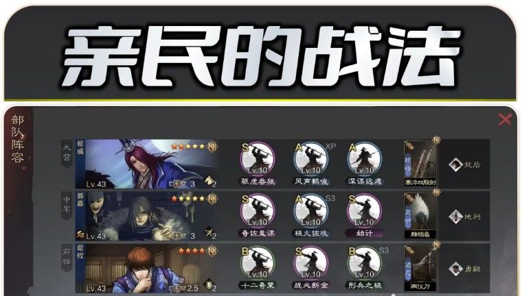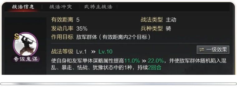 除了一个战必断金和始计是S级战法以外,风声鹤唳、极火佐攻、深谋远虑和形兵之极都是很容易获得的战法。在目前大量队伍追求爆发和快速解决战斗的风气下,这队依靠深谋远虑、风声鹤唳、极火佐攻和始计增伤,实现了指挥战法+主动战法+被动战法三层增伤。依靠小荀攸的瞬发45%发动几率的【十二奇策】移除友军单体的有害效果,并提供洞察、规避、先手状态。