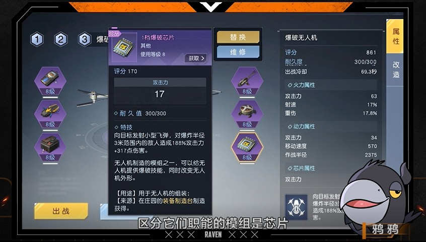 无人机由六个模组组成,其中【核心】、【续航】、【结构】、【火力】、【动力】五个模组为通用模组,为每一种无人机都有的基础配件。唯一不同的是【芯片】模组,包括爆破芯片、电磁芯片、治疗芯片,【芯片】模组的属性决定了成品无人机的功能。是不是很容易呢?幸存者只需要分清芯片就可以组装自己想要的无人机。