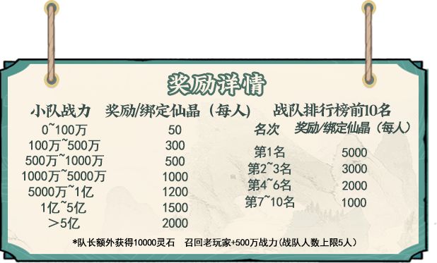 每个小队根据不同的总战力档位获取不同的绑晶奖励。(小队成员最多5人)