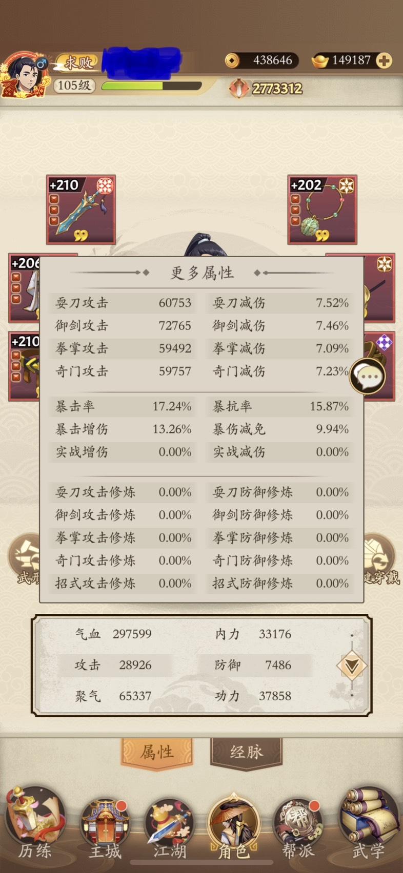 目前105级,帮派基础83级,面板聚气6万五,什么水平