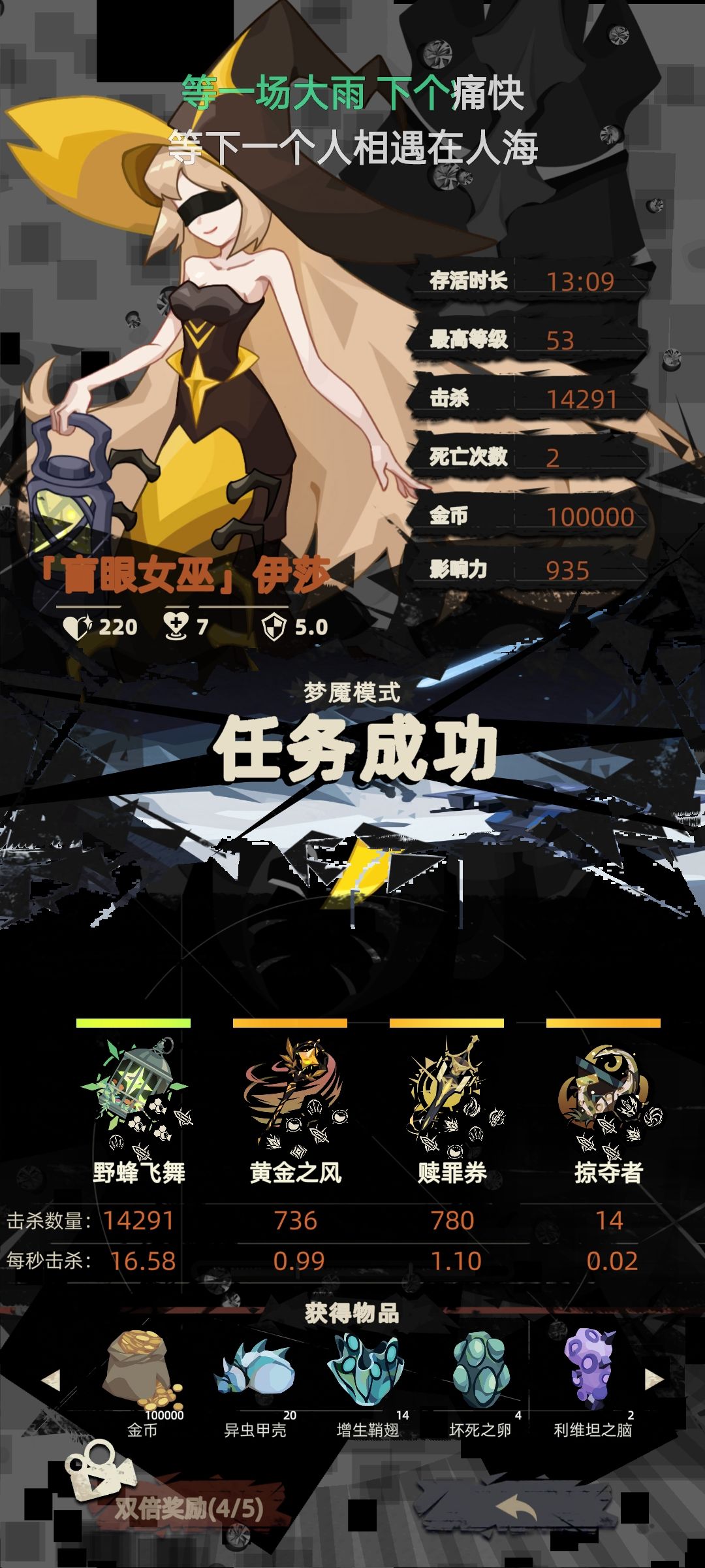 3级虫妈3增殖3伤害直接绿虫挂机,其他三个除了猫猫铃铛,祝福选3金金币加成,饮料刷百分之25敌人数量加成,重影没试过不确定能不能满金