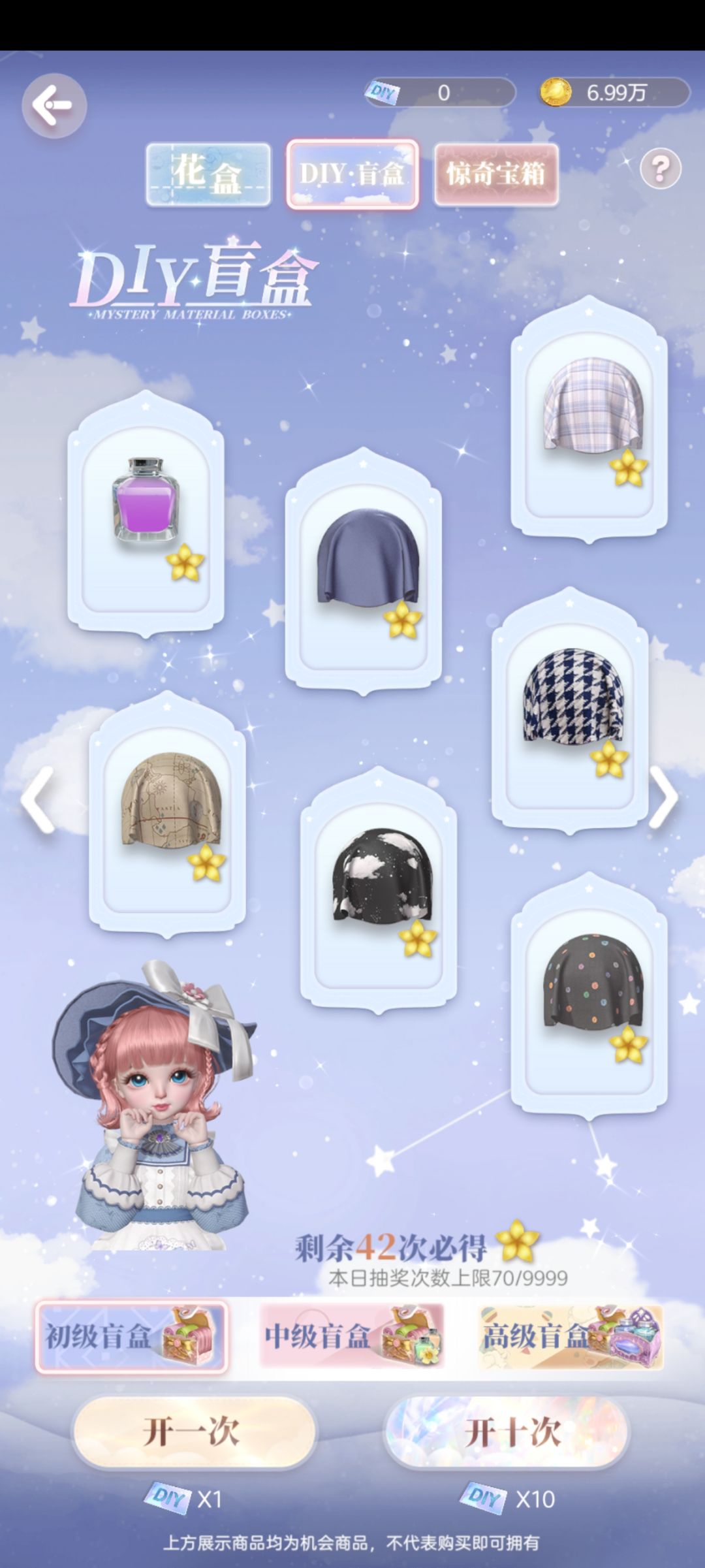 喜欢DIY的姐妹可以选择用金币开盲盒,我是昨天才想起来可以用金币开qaq之前都是用的送的,前期可以选择开第一个,十次只要五万,但是不给六星,六星只有第二个和第三个才给