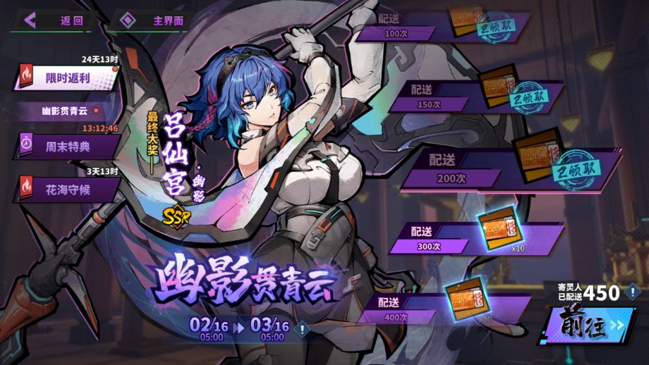 活动期间,完成寄灵人配送达到指定次数,即可领取相应的奖励。奖励包含大量「灵将契约券」,最高可获得当期活动UP池概率提升SSR寄灵人和专属红品武器奖励。