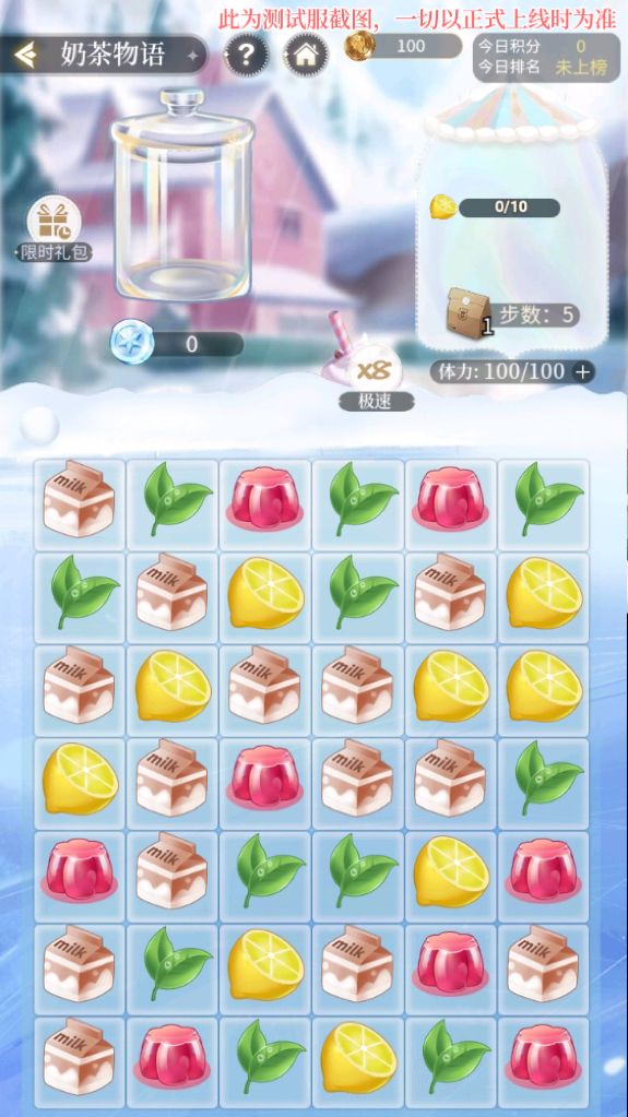 三小姐可在7*6的格子中交换“小料”位置,使3个及以上同种“小料”形成一行或者一列,即可消除给奶茶成功加料。 消除“小料”可获得冬雪币和分数,达成连续消除还可获得额外分数加成,连消次数越多加成越高。