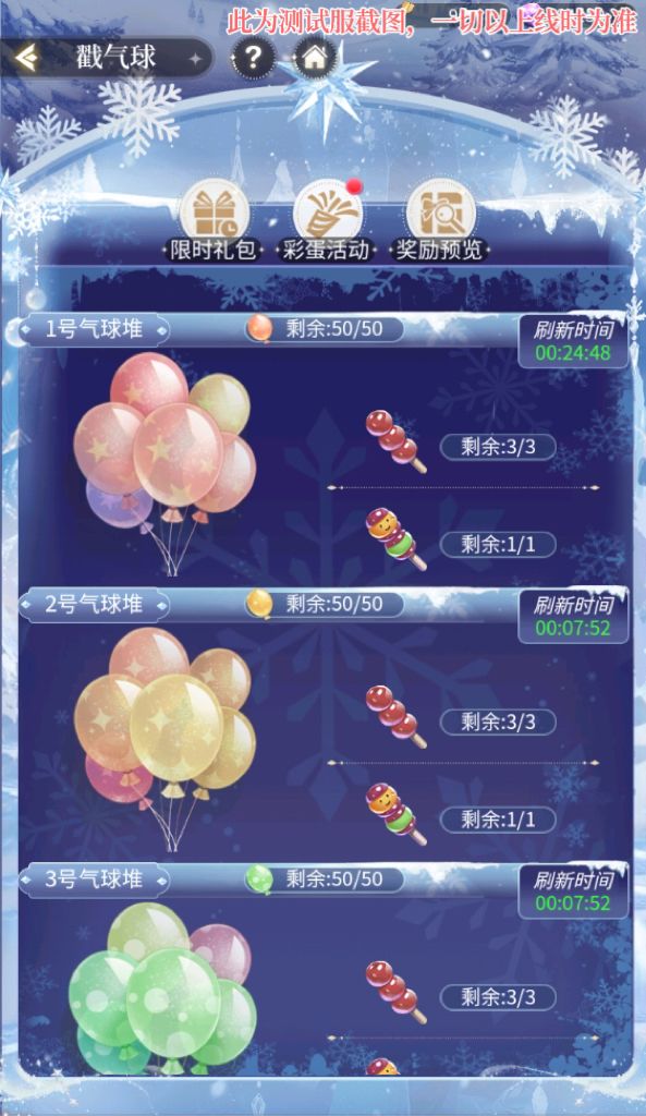 气球摊老板准备了多个气球池,三小姐可以选择自己喜欢的气球池参与活动。每个气球池内奖励为所有玩家共享,当气球池内糖葫芦和什锦糖葫芦全部被戳走时,不论该气球池是否到达刷新时间,该气球池立刻关闭并进入备货期。