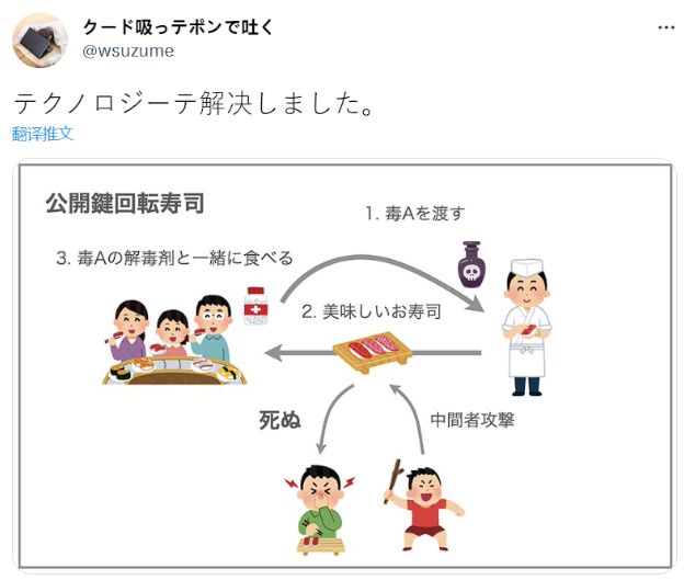 “干脆让顾客准备一个毒药给厨师,让厨师往寿司里下毒,顾客提前吃解药,就算吃了毒也不会有问题。”
