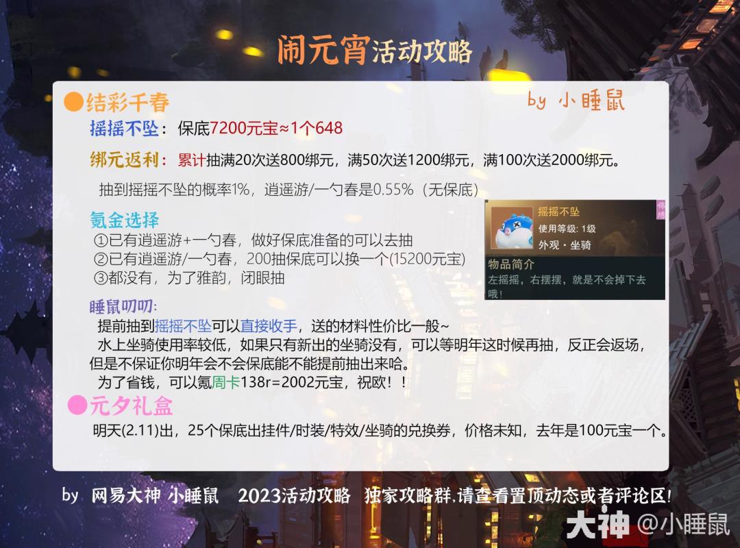 闹元宵活动攻略合集!结彩千春、元夕礼盒、千灯愿、天落云锦、青瓷探珍、兔年限定、千灯小铺、升平市热门道具及氪金数攻略来咯