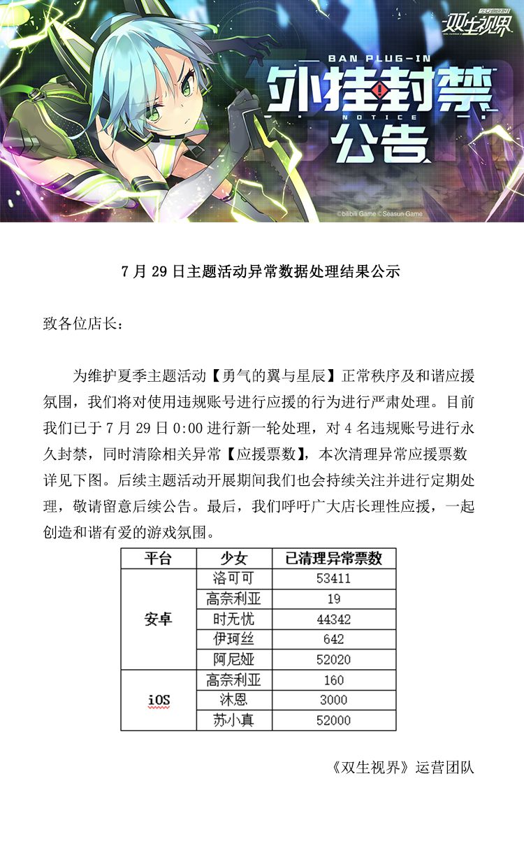 为维护夏季主题活动【勇气的翼与星辰】正常秩序及和谐应援氛围,我们将对使用违规账号进行应援的行为进行严肃处理。本批共计永久封禁4名违规账号,同时已清除相关异常【应援票数】,详见下图。