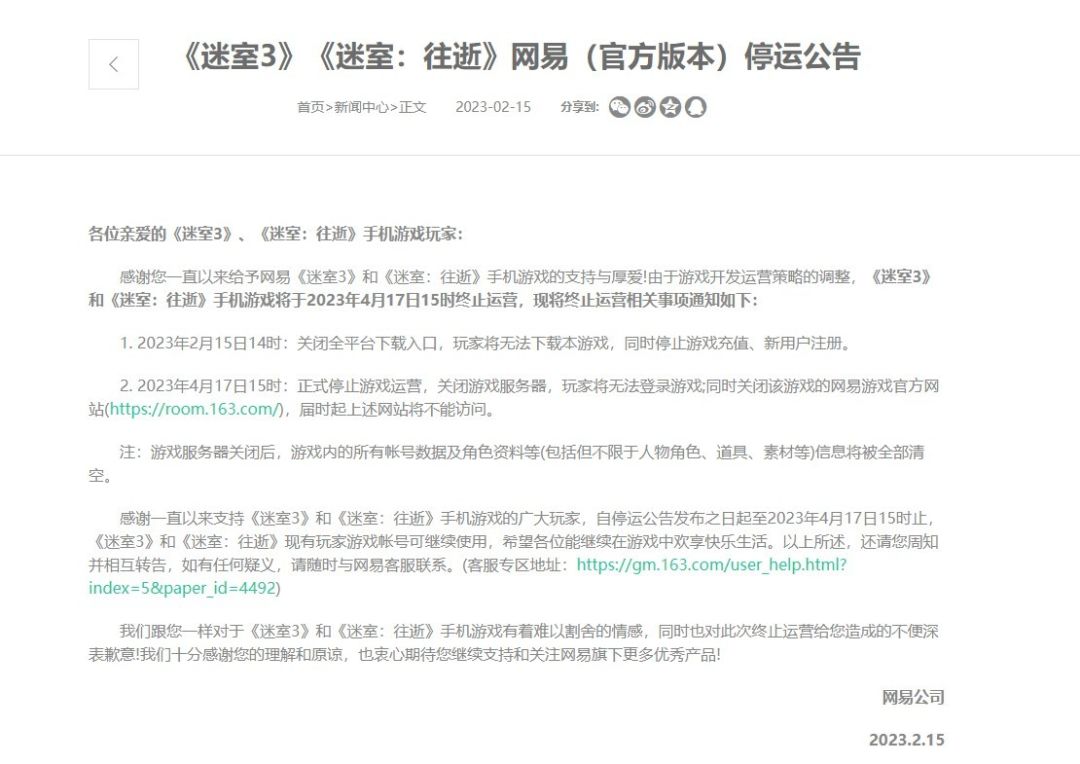 由网易游戏代理的《迷室3》《迷室:往逝》手游国服今日(2月15日)发布停服声明,宣布将于2023年4月17日15时终止运营,原因是游戏开发运营策略调整,游戏目前已关闭全平台下载入口,同时停止游戏充值、新用户注册,现有账号的玩家可以继承使用,直到停服。
