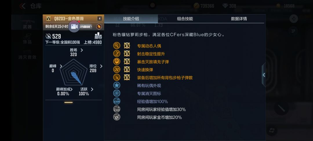 虽然商城中金色蔷薇需要充值到VIP3,并以4680钻石的价格购买,但其淡粉色加动感人偶的颜值着实讨喜。下面我们来观察金色蔷薇的数据表现。
