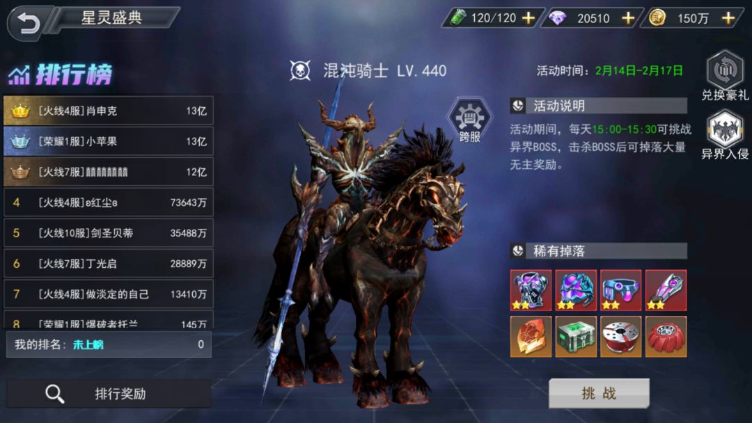异兽入侵活动属于限时活动,在活动期间各位50级以上玩家可以从星灵盛典入口进入战场挑战BOSS,在挑战期间战死或者被他人击杀退出副本重新进入副本不会清除已有伤害记录,亦可选择花费钻石原地复活,接着战败之前的记录继续挑战。