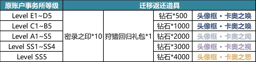 2. 迁移福利:在老用户专属迁移返还区服“红墓市”中,将根据原账户事务所等级发放对应的钻石、限定头像框,在正式开服后14天内,将通过邮件继续进行发放。