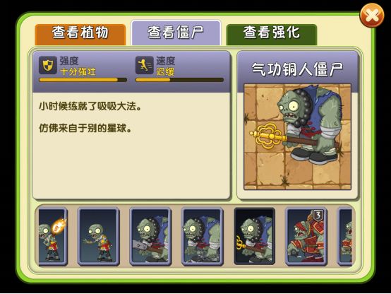 禅杖铜人拥有两种技能,一是发动气功,将本行植物向右移动一格。由于只有到第8列才能发动,因此它并不能造成多大威胁,只要控制住僵尸,及时击杀即可。