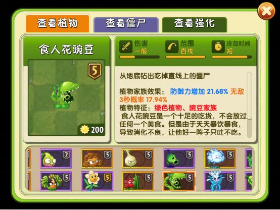 无尽中有许多熊果不能击飞的中型僵尸,传统的“吃货”植物大嘴花、金蟾菇看到它们无能为力(例外的是大嘴可以吃黑暗无尽的法师僵尸)。相比之下,食人花豌豆就不那么挑食。
