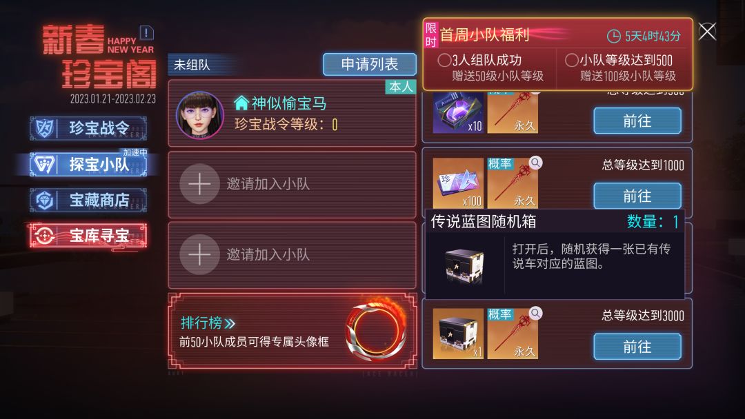 『珍宝阁-探宝小队』活动期间,玩家可以邀请自己好友或陌生人加入自己的小队,小队总等级达到要求后,可以领取对应的奖励,每次领奖都概率获得限定外观。