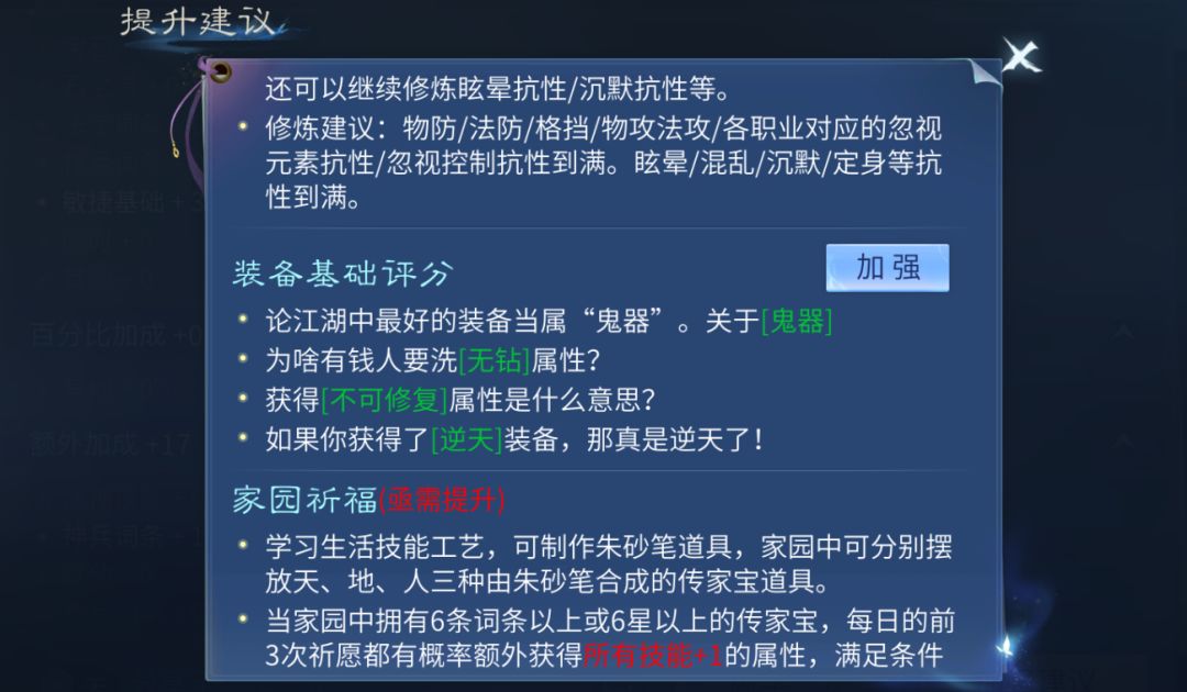 在属性构成界面,小萌新同样可以了解到一些提升建议与词条释义。