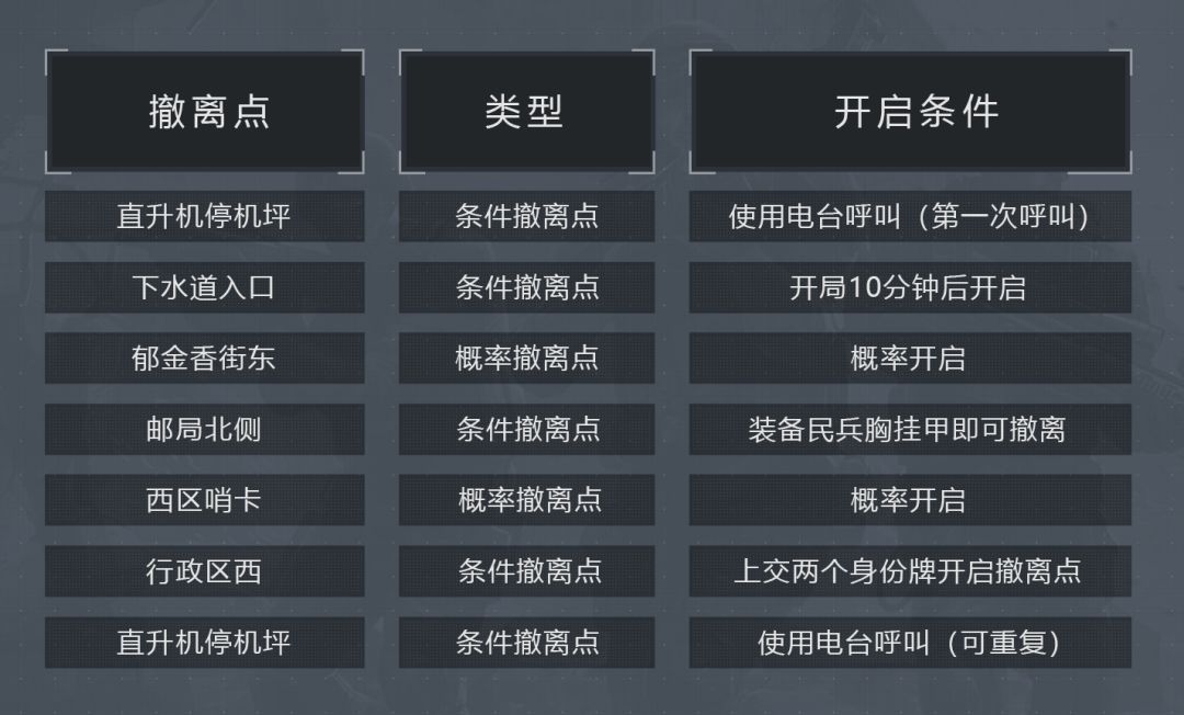 除了这两处撤离点外,地图中还有两个概率撤离点和两个条件撤离点。位于地图西侧餐厅附近的西区哨卡撤离点(5号撤离点)和位于郁金香街东的撤离点(3号撤离点),有50%的概率开启。地图北部的邮局北侧撤离点(4号撤离点)需要穿戴“民兵胸挂甲”并坚守20秒才能撤离,“民兵胸挂甲”可以通过淘汰附近的游荡者获取。地图南部的行政区西撤离点(6号撤离点)需要上交两枚身份牌,并坚守20秒即可撤离。如果在行政楼区域激战之后,不想冒风险从下水道或者直升机撤离,那么交身份牌撤离无疑是最佳选择。