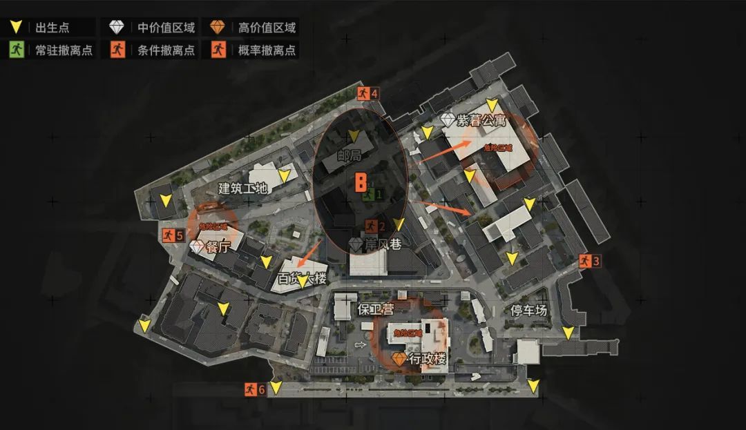 地图西侧的A区域出生点分布较为均匀,距离餐厅较近,前期可能会围绕餐厅的物资点展开博弈,这里环境逼仄,容易突发巷战。但广场附近较为开阔掩体较少,建筑工地出生点的先锋可以选择先上楼架枪,阻击从餐厅经广场前往百货大楼后门的先锋。不过建筑工地本身没有什么物资,主要以获取信息为主,不要停留太久。如果围绕餐厅发生了交火冲突,结束战斗后可以根据状态选择下一个目标,百货大楼出生点的先锋也可以选择直接从营区侧门进入保卫营,再前往行政楼。之后如果状态良好,可以考虑前往岸风巷搜索物资,或者伏击其他可能路过的先锋小队。如果状态不佳,备弹不足,建议直接撤离。