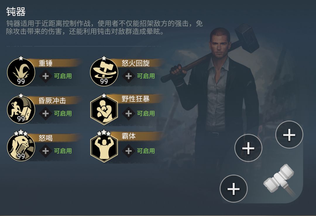 比方来说,如果我们想进行具有进攻性的小规模战斗时,就可以选择野性狂暴+昏厥冲击+重锤的技能组合。