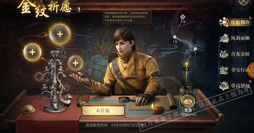 参与日常玩法可获得禁婆香,与好友共同点燃禁婆香可增强青铜神树愿力。青铜神树愿力越强,次日获得许愿奖励越好。
