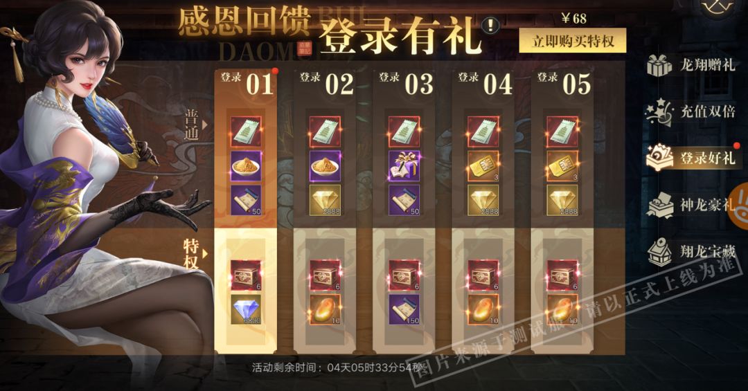 购买进阶特权可额外领取丰富奖励:青龙豪华礼盒、昆天脂玉、九门秘籍、蓝钻。