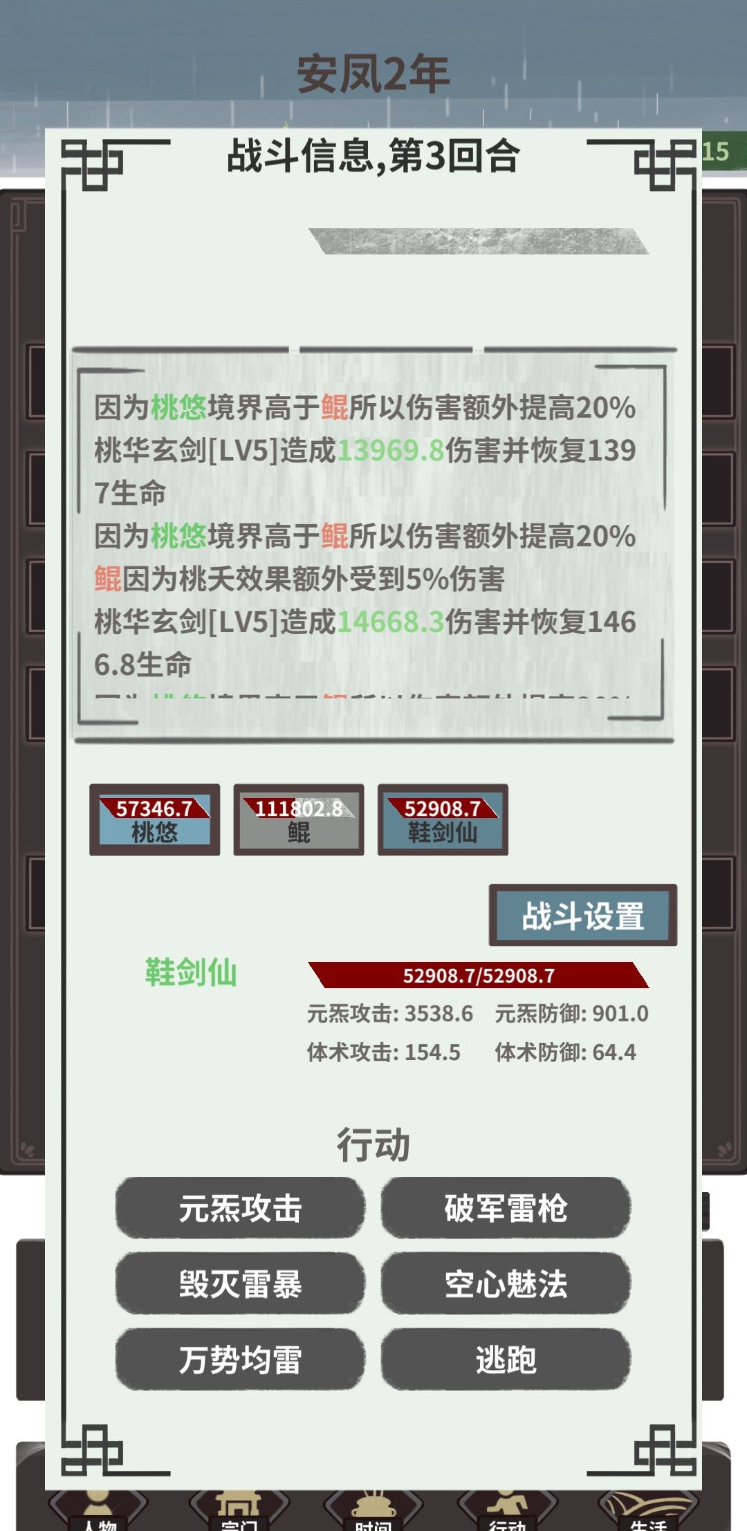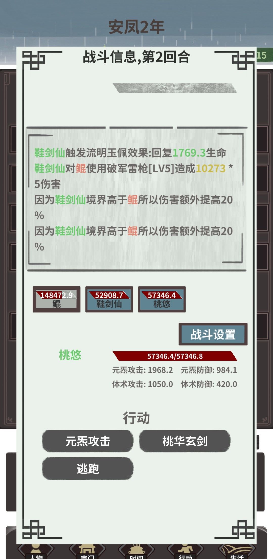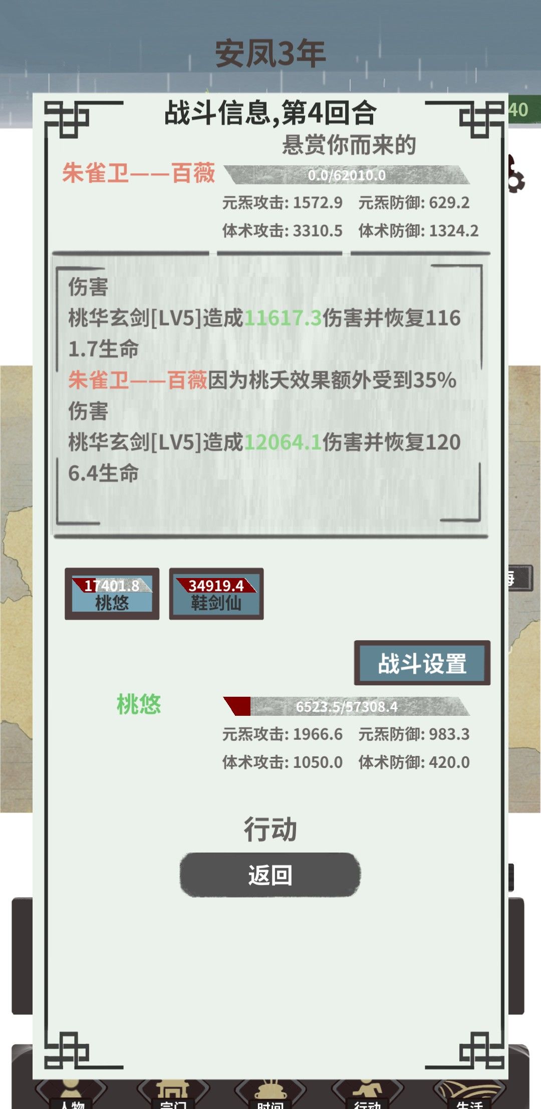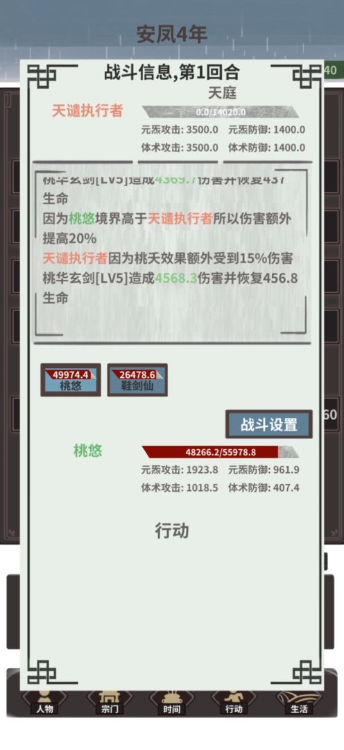 打最强四象朱雀,四回合解决,建议提前准备一两个挡刀工具人,或者净源丹打完给桃悠治疗伤势,因为雷枪打朱雀属性弱势,主要靠桃妖输出,当然,属性比我高些应该就更好打了