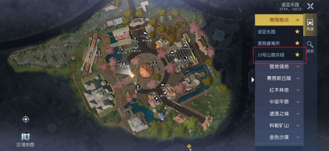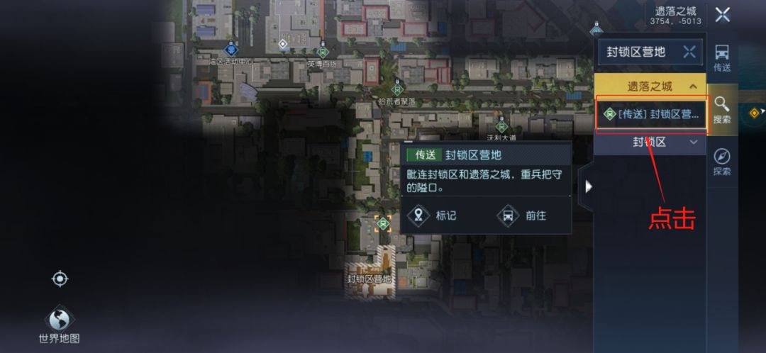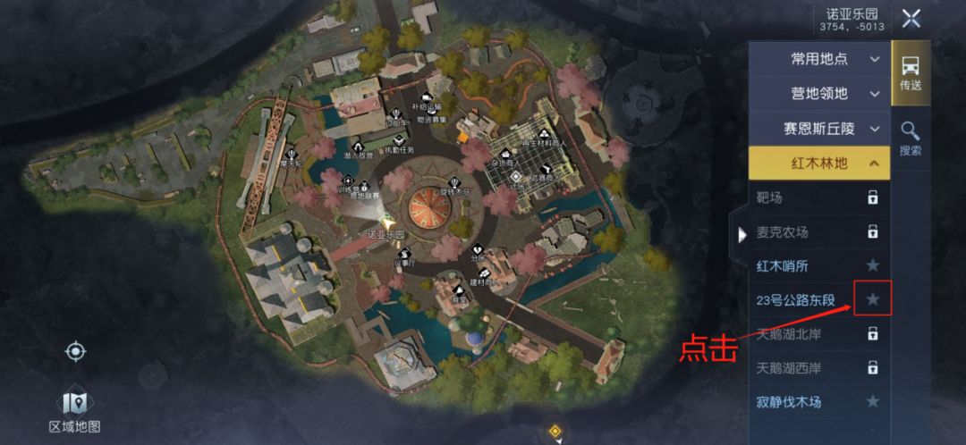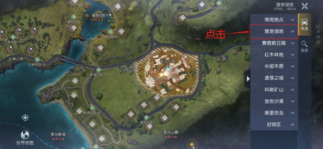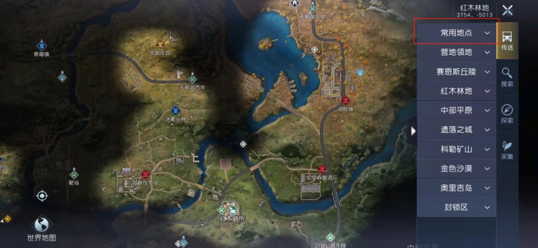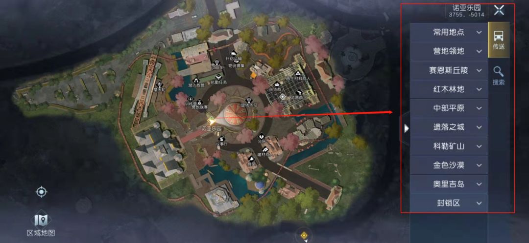 首先,点击操作界面右上角的圆形【地图】,打开后玩家可以直接看到游戏地图,右侧部分就是【传送】功能界面。